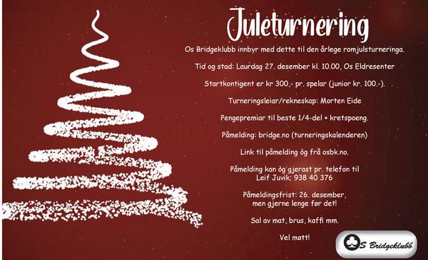 Øsande regn, pøsande regn, men kva gjer vel det. Flotte forhold uansett for juleturnering med 28 par på startstreken denne gongen. Vann gjorde Sigurd Østerbøvik og Jim Høyland.